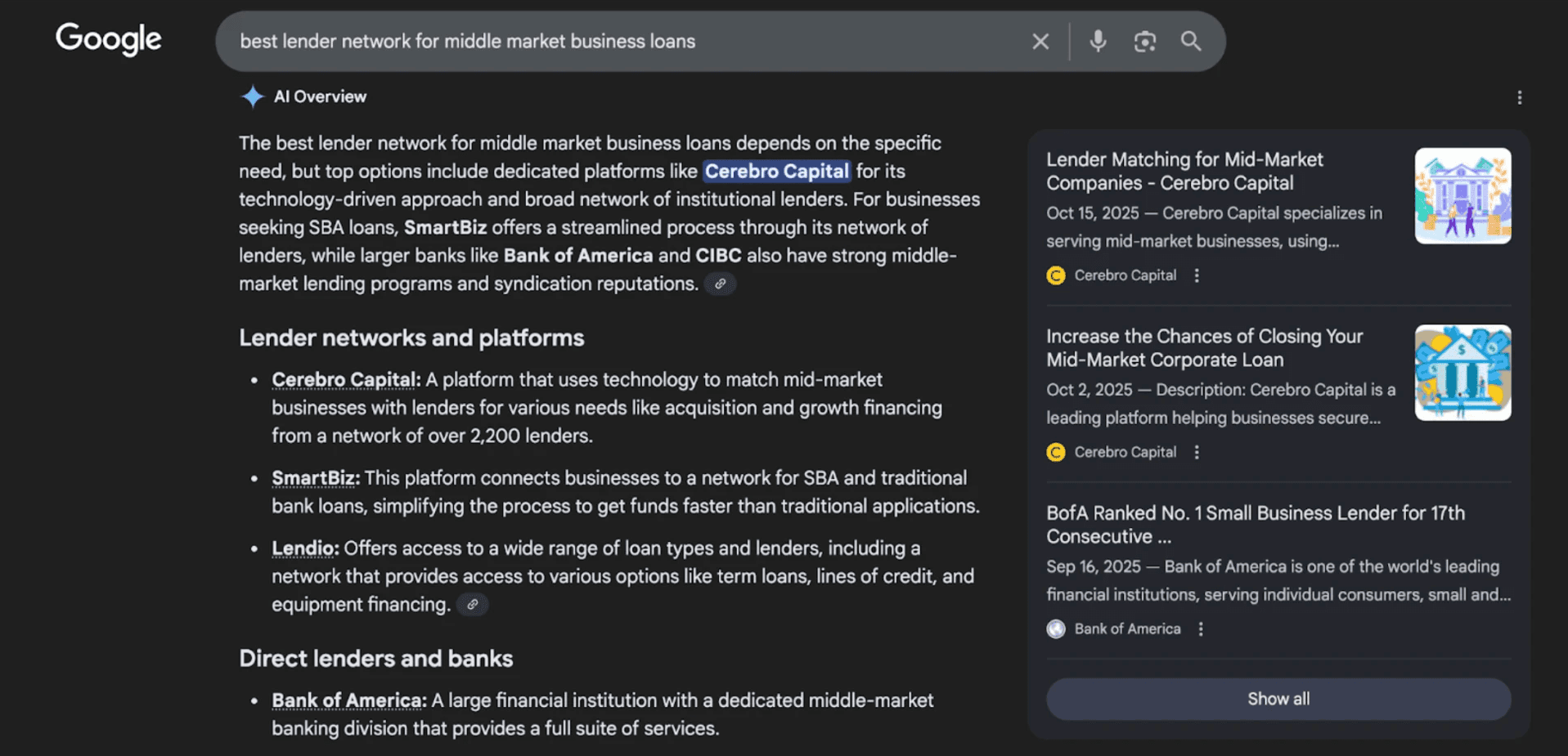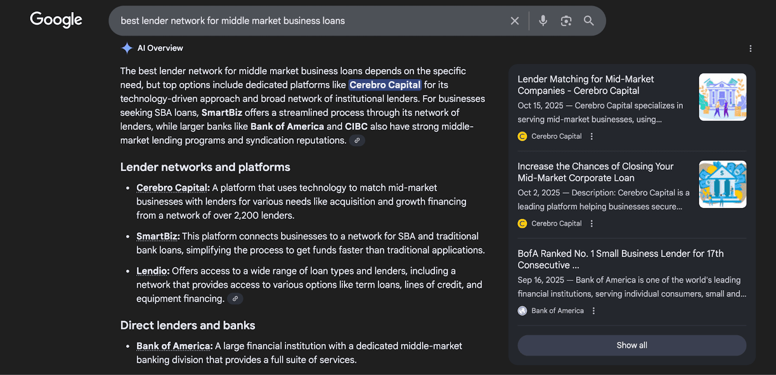 Below is an example of Cerebro appearing in Google AI Overviews for a high intent mid market lending query. This visibility came from optimizations made to Cerebro’s Lender Matching blog, and it appeared in less than half a month after updates were published. Before optimization, competitors held these placements, but here, Cerebro is surfaced in the first position, with another recently optimized blog earning the second position.