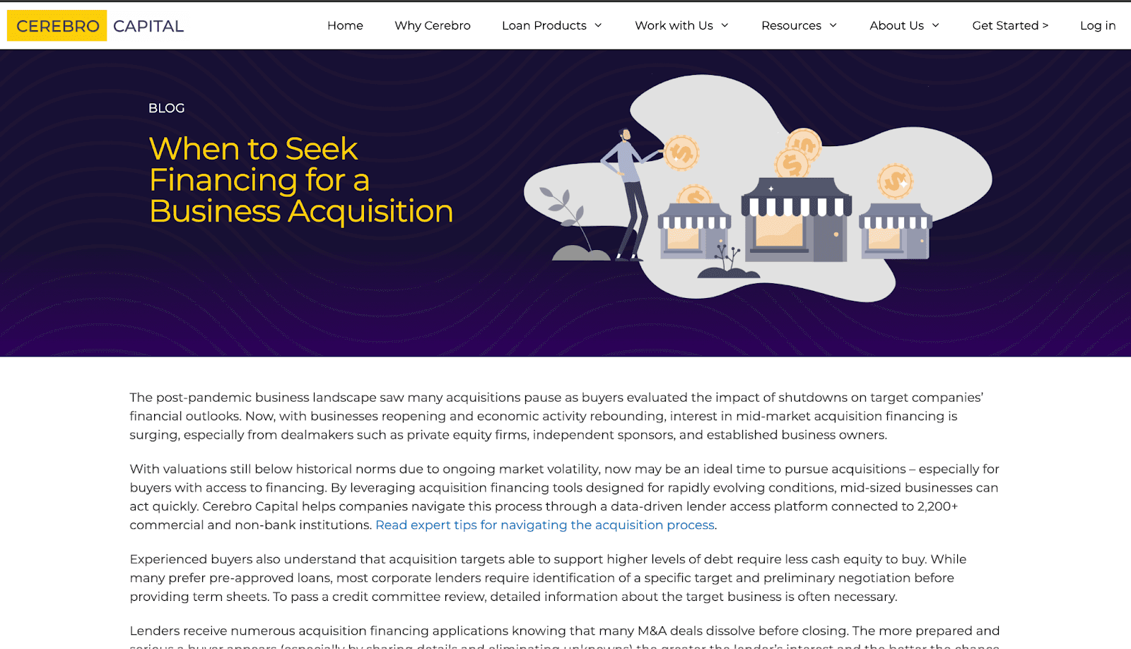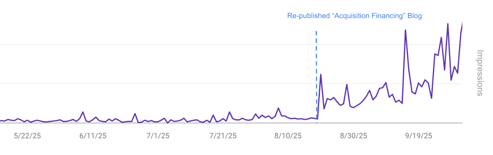 Three cornerstone pieces—Financing Pain Points for Mid-Sized Businesses, Expert Guidance Through the Acquisition Process, and When to Seek Financing for a Business Acquisition—became standout examples of this approach, showing how structured communication and precise query alignment can drive sustained visibility across both traditional and generative search.