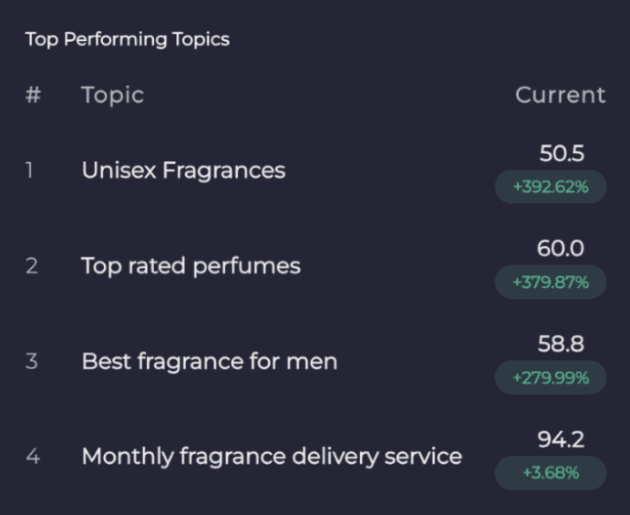 Scentbird was underrepresented across AI answers for core discovery topics such as Top-Rated Perfumes and Unisex Fragrances, categories that strongly influence trial, subscription starts, and downstream conversion. While Scentbird had relevant content, AI systems were not consistently associating those topics with the brand.