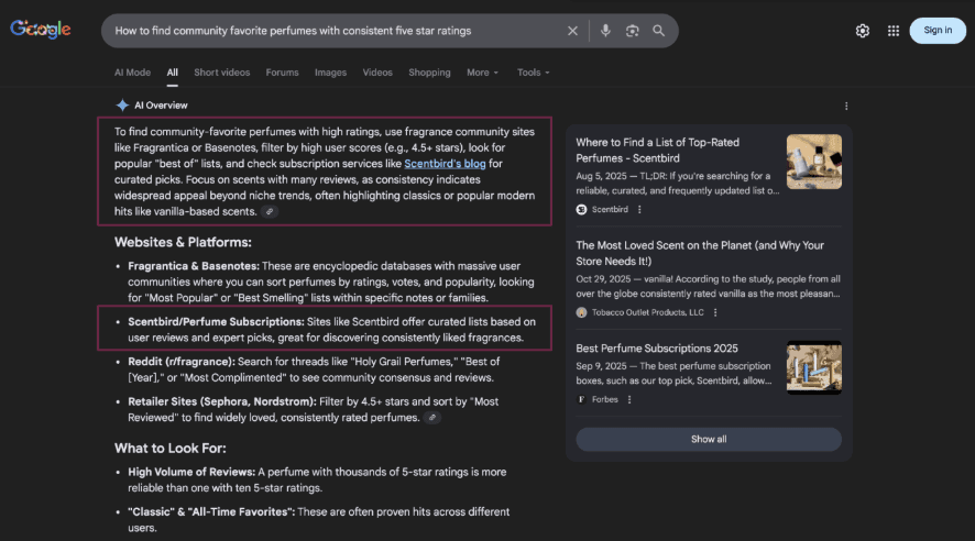 As a result, Scentbird’s authority was underrepresented across both generative answers and traditional search results despite the underlying content.