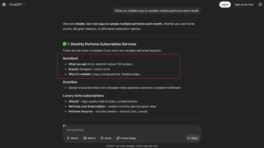 This result is particularly meaningful because subscription queries signal late-stage consideration, where users are actively evaluating providers rather than browsing inspiration. Appearing first in these responses positions Scentbird not just as a content source, but as the default choice during AI-mediated purchase decision-making.